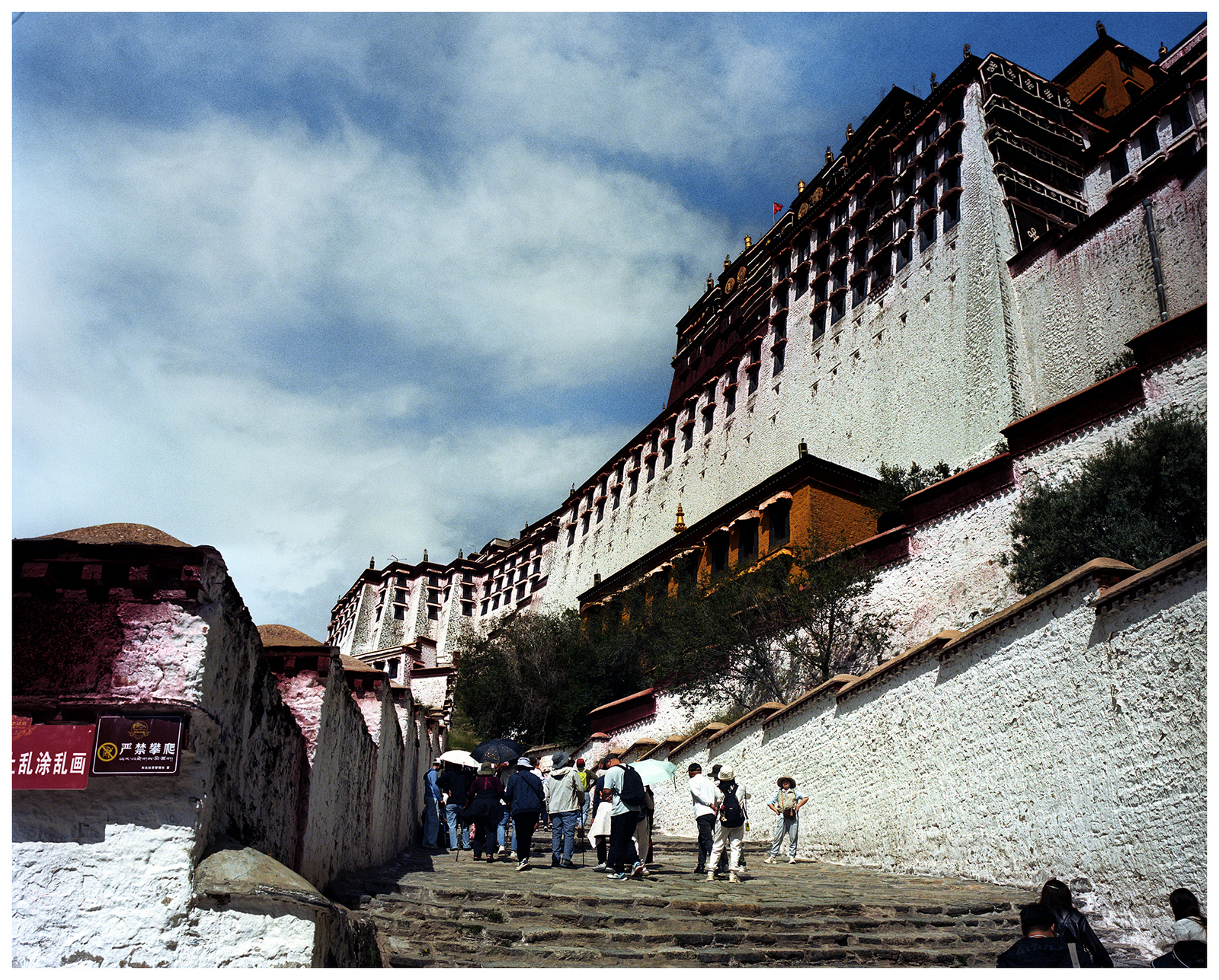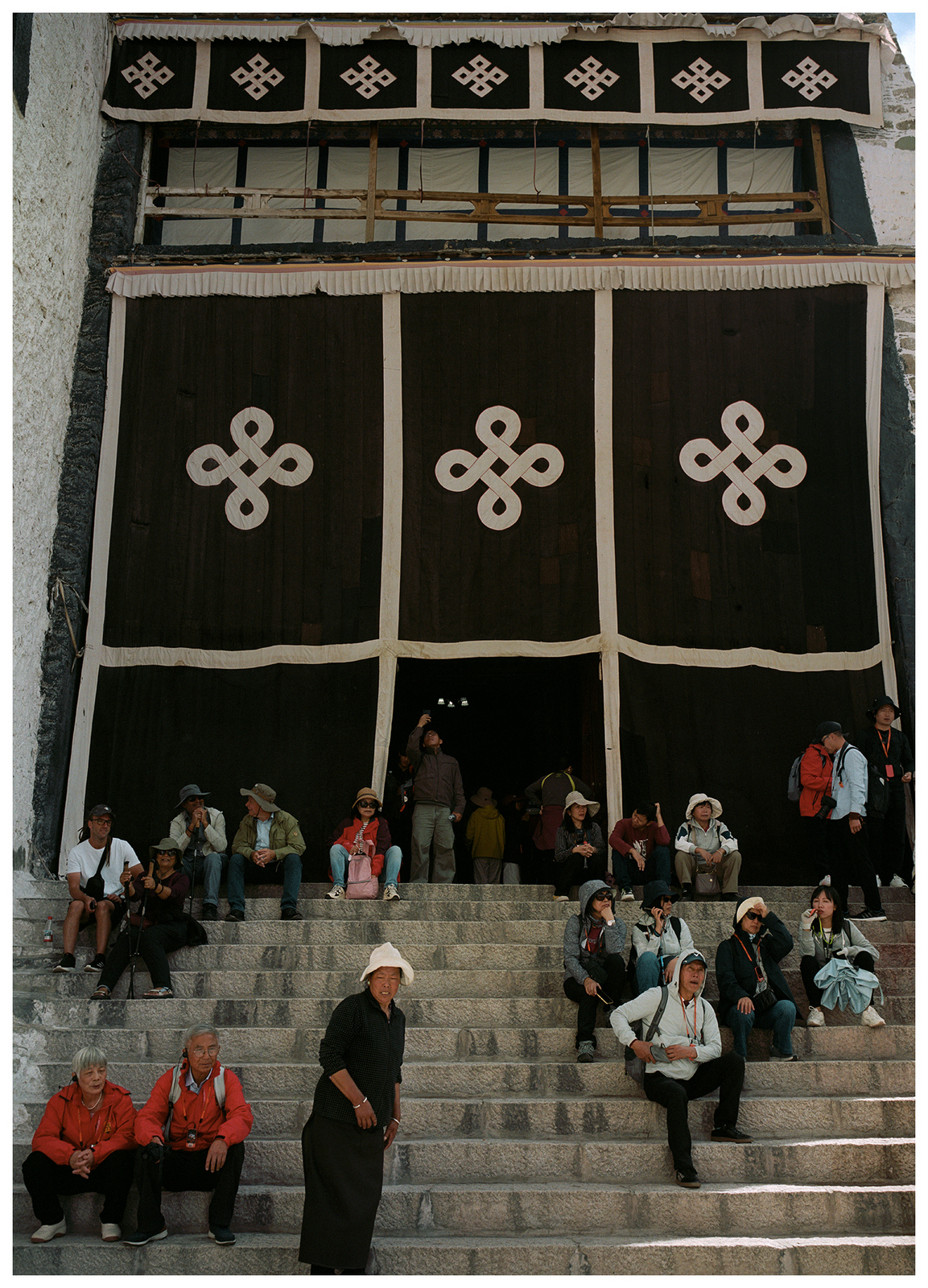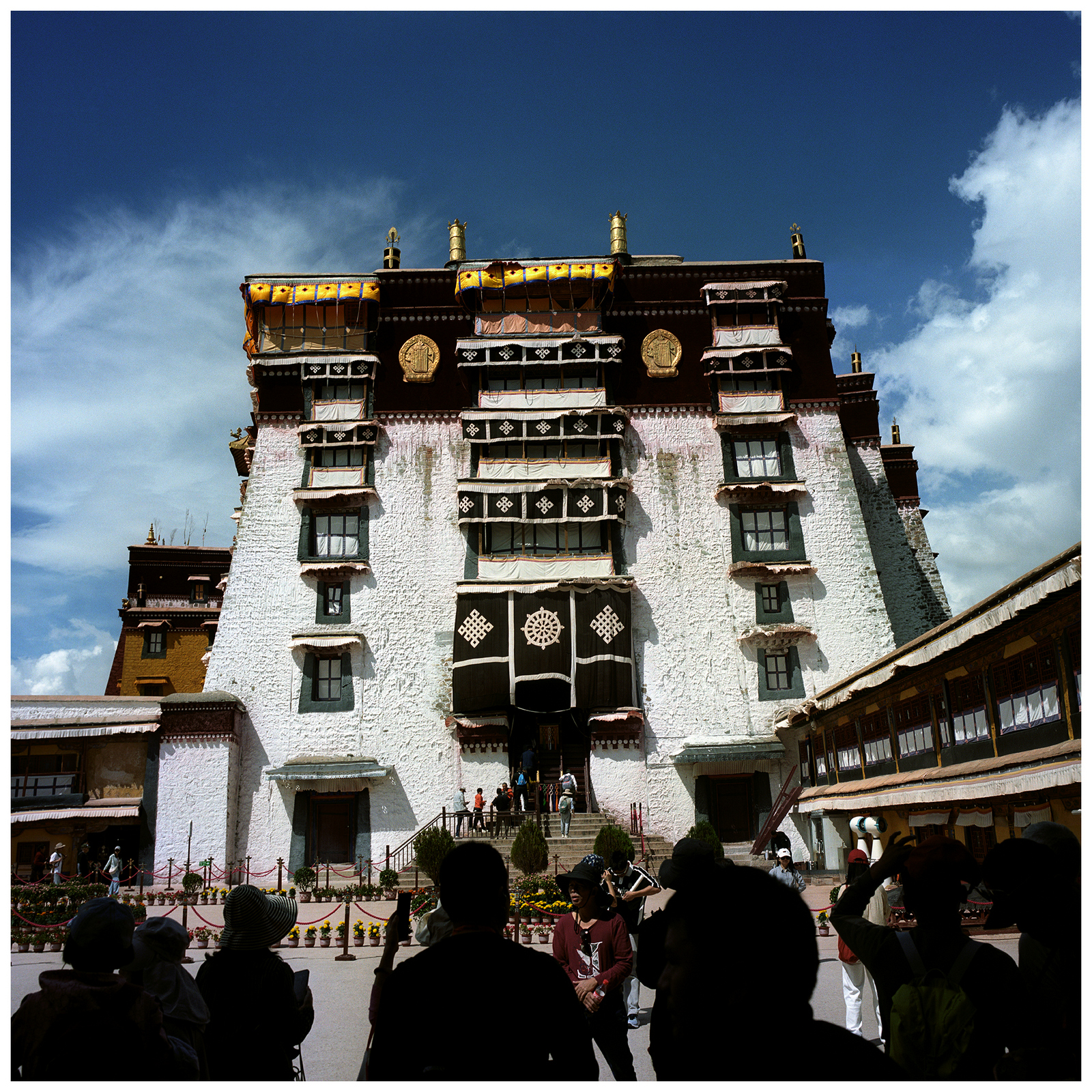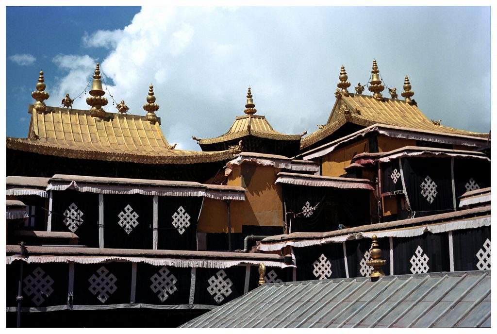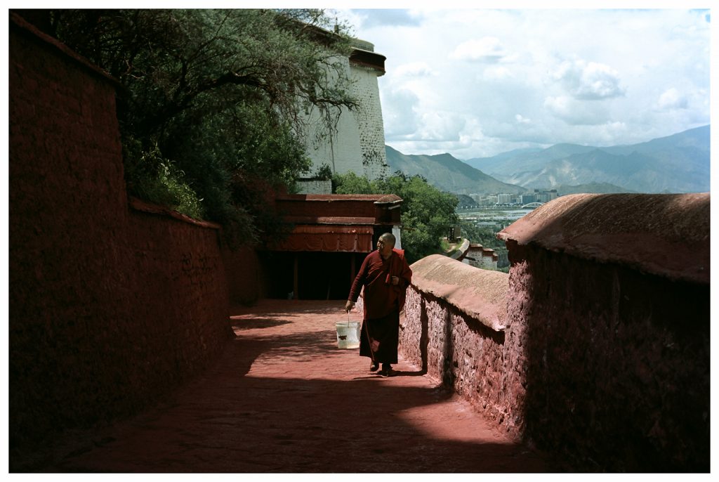 From the top of Red Hill (Marpo Ri), the Potala Palace—the former winter residence of the Dalai Lamas—rises above the landscape of Lhasa. The structure seen today, with more than 1,000 rooms across 13 stories, was largely built in the latter half of the 17th century. Constructed from rammed earth, stone, and wood, it follows the dzong fortress style and incorporates architectural influences from Chinese, Indian, and Nepalese traditions.